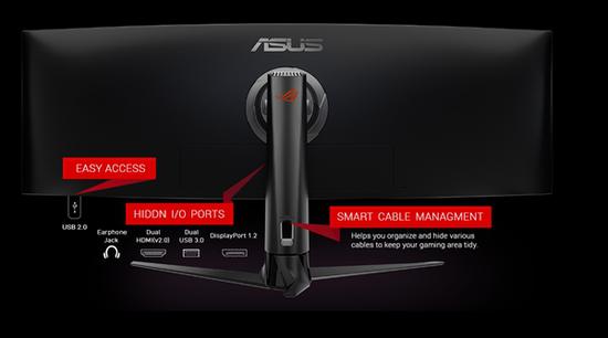 显示器支持左右16度旋转、上下120毫米高度调节、+20度到-5度俯仰调节,接口有一个USB 2.0、两个USB 3.0、一个3.5mm耳机孔、两个HDMI 2.0、一个DisplayPort 1.2。