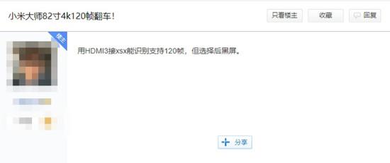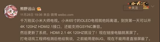 据网友爆料,采用联发科芯片的小米电视‘大师’65“OLED出现了严重的翻车现象。原本可以支持4K 120Hz以及GSYNC技术的小米电视‘大师’65”OLED,在进行一次系统升级后就不支持4K 120Hz技术,并且还出现了连接电脑黑屏的现象,可谓是严重翻车。不过翻车的锅要由联发科来背,不止小米,其他采用联发科芯片的游戏电视也纷纷翻车。连索尼也不例外,只不过索尼依靠自身的技术实力翻车不算特别严重,X9000H仅是在开启4K 120Hz时会出现字体模糊的情况,并不是不能开启。目前就只有采用自家芯片的LG E9和C9系列电视没有出现翻车的现象。