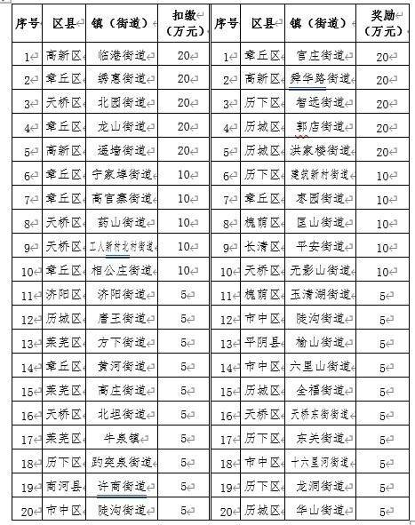 8月份,资金奖惩相抵后,章丘区、天桥区、高新区、莱芜区、济阳区、商河县分别扣缴资金45万元、30万元、20万元、15万元、5万元、5万元;历城区、历下区、槐荫区、市中区、长清区、平阴县分别奖励资金45万元、35万元、15万元、10万元、10万元、5万元,具体镇(街道)资金奖惩情况见下表。