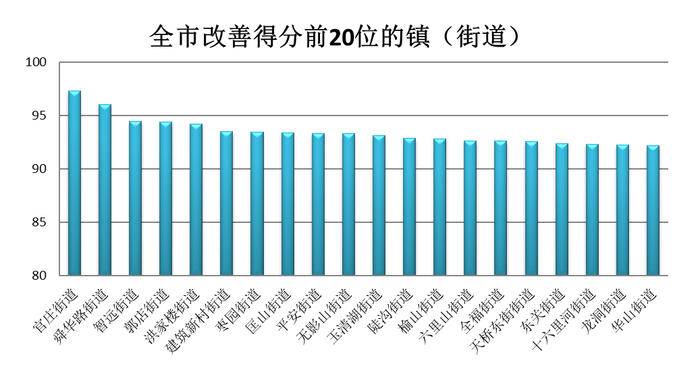 进入全市改善排名前20名的镇(街道)中,历下区、历城区各4个,市中区3个,槐荫区、天桥区、章丘区各2个,长清区、平阴县、高新区各1个。改善排名正数第1至20位分别为官庄街道、舜华路街道、智远街道、郭店街道、洪家楼街道、建筑新村街道、枣园街道、匡山街道、平安街道、无影山街道、玉清湖街道、陡沟街道、榆山街道、六里山街道、全福街道、天桥东街街道、东关街道、十六里河街道、龙洞街道、华山街道。