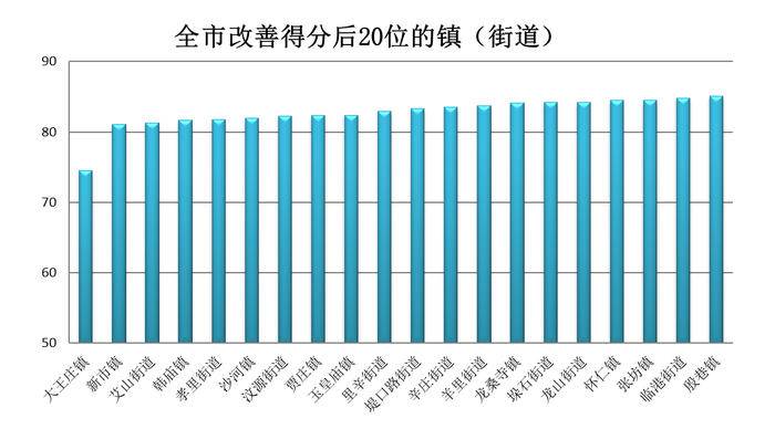 进入全市改善排名后20名的镇(街道)中,商河县8个,钢城区4个,济阳区、莱芜区各2个,天桥区、长清区、章丘区、高新区各1个。改善排名倒数第1至20位分别为大王庄镇、新市镇、艾山街道、韩庙镇、孝里街道、沙河镇、汶源街道、贾庄镇、玉皇庙镇、里辛街道、堤口路街道、辛庄街道、羊里街道、龙桑寺镇、垛石街道、龙山街道、怀仁镇、张坊镇、临港街道、殷巷镇。