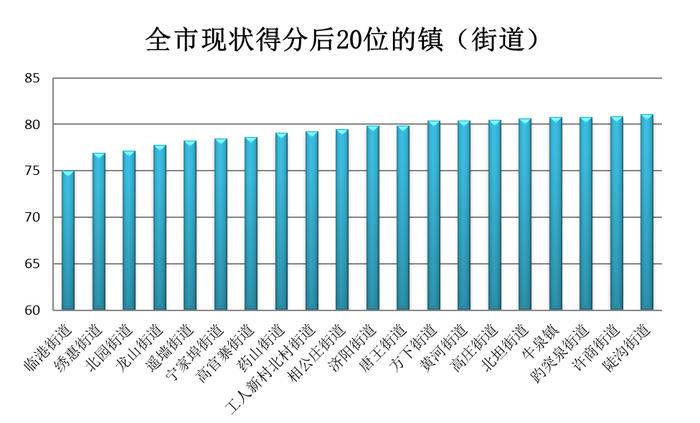 进入全市现状排名后20名的镇(街道)中,章丘区6个,天桥区4个,莱芜区3个,高新区2个,历下区、市中区、历城区、济阳区、商河县各1个。现状排名倒数第1至20位分别为临港街道、绣惠街道、北园街道、龙山街道、遥墙街道、宁家埠街道、高官寨街道、药山街道、工人新村北村街道、相公庄街道、济阳街道、唐王街道、方下街道、黄河街道、高庄街道、北坦街道、牛泉镇、趵突泉街道、许商街道、陡沟街道。