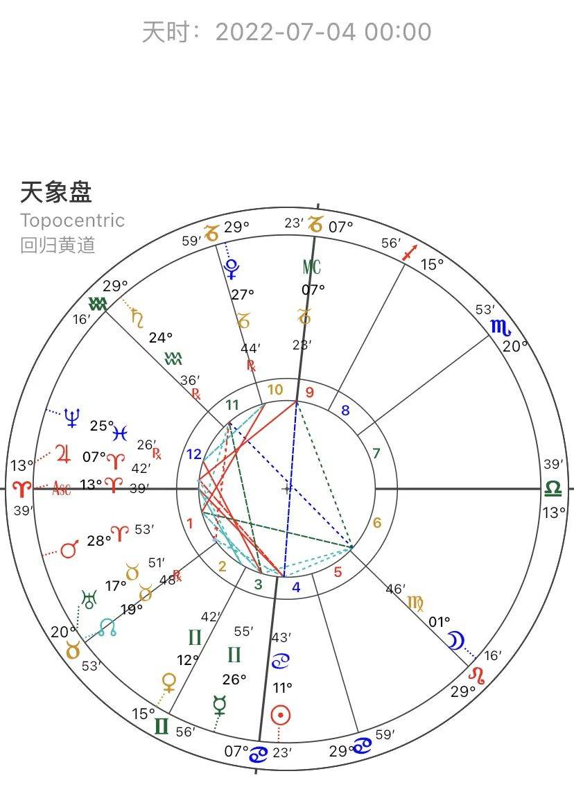 本周的天象图以beijing,beijing,china为坐标,当地标准时间2022-07-04 0:00为参考,重点行星有金星、水星、太阳、木星,重点相位有:日木刑、日刑升、日冲中天、金木六合、金升六合、水火六合。