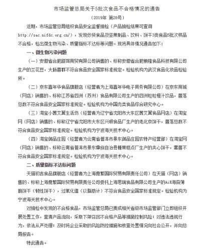 中新网8月21日电 据市场监管总局网站消息,近期,市场监管总局组织食品安全监督抽检,发现炒货食品及坚果制品、饮料、饼干3类食品5批次样品不合格,其中饼干类3批次不合格样品来自淘宝与天猫。