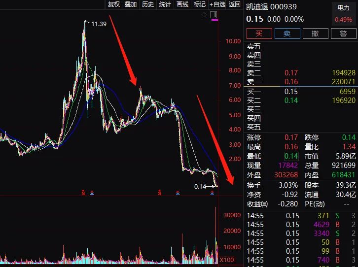 就这么一个股票,就这么退市了!复权来看,凯迪退在2015年6月高位,股价曾达到11.39元(前复权),而后一路暴跌,至今只剩0.15元,股价跌幅高达98.68%。
