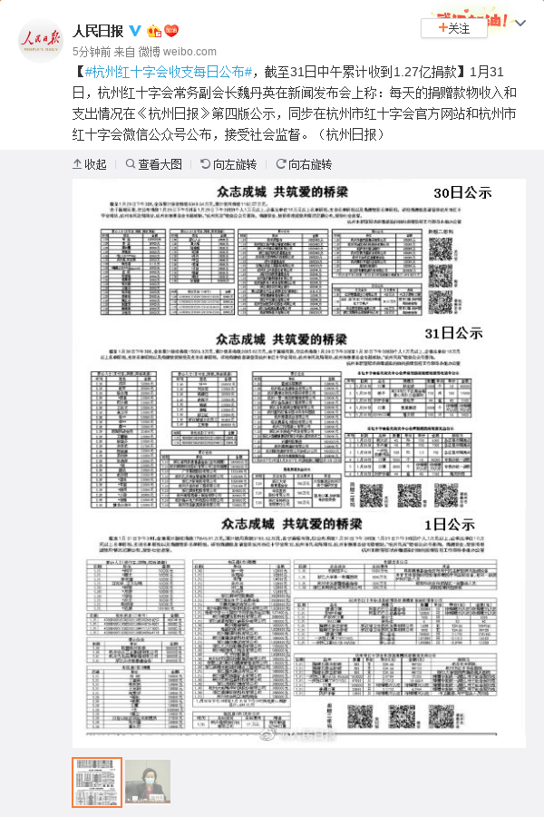 1月31日,杭州红十字会常务副会长魏丹英在新闻发布会上称:每天的捐赠款物收入和支出情况在《杭州日报》第四版公示,同步在杭州市红十字会官方网站和杭州市红十字会微信公众号公布,接受社会监督。