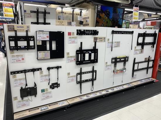 另外这里还有各种各样的电视挂架,不仅可以适应各种各样的尺寸大小,还能满足电视在挂墙后的旋转、伸缩、升降等使用需求。