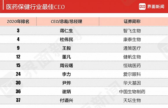 近年来,医药行业发展迅猛,在最佳CEO的前五名中有两名来自医药行业,分别是智飞生物的董事长兼总经理蒋仁生和康泰生物的董事长兼总裁杜伟民。