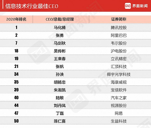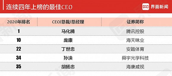 原标题 界面新闻发布2020中国上市公司最佳CEO:腾讯控股马化腾再夺第一,阿里巴巴张勇第二