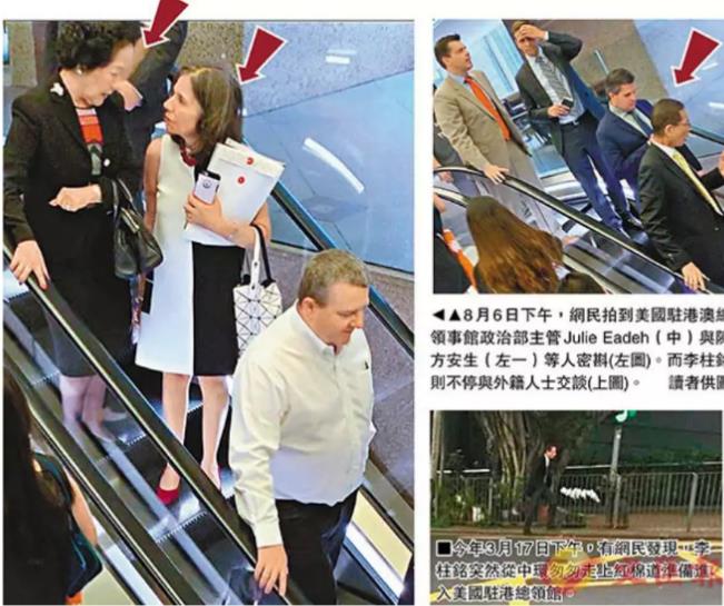 8月初,有网友拍到李柱铭与美国驻港澳领事馆政治部主管Julie Eadeh在停车场(白衣男子为李柱铭,白衣女子为Julie Eadeh)