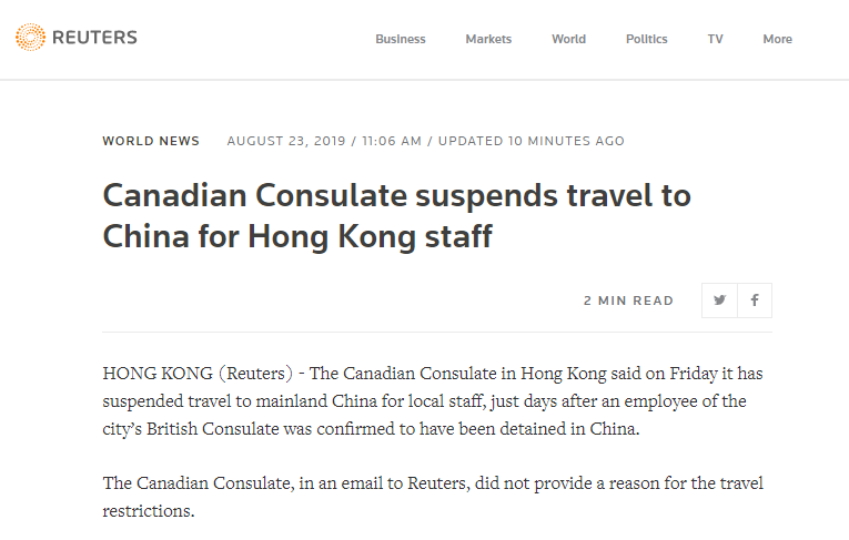 路透社称,加拿大驻香港总领事馆在给路透社的邮件中没有透露暂停本地员工前往中国内地的原因。