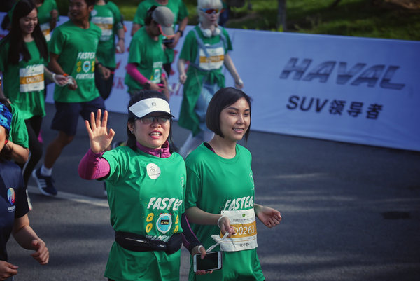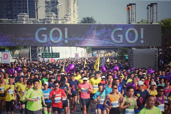7时20分,第一道发令枪响起,300名特殊跑友冲出起跑线。而随后第二道发令枪响起后,8000名跑友开启自拍模式纷纷向终点跑去,经过了6分钟的时间,比赛大军才完全开出起跑线。