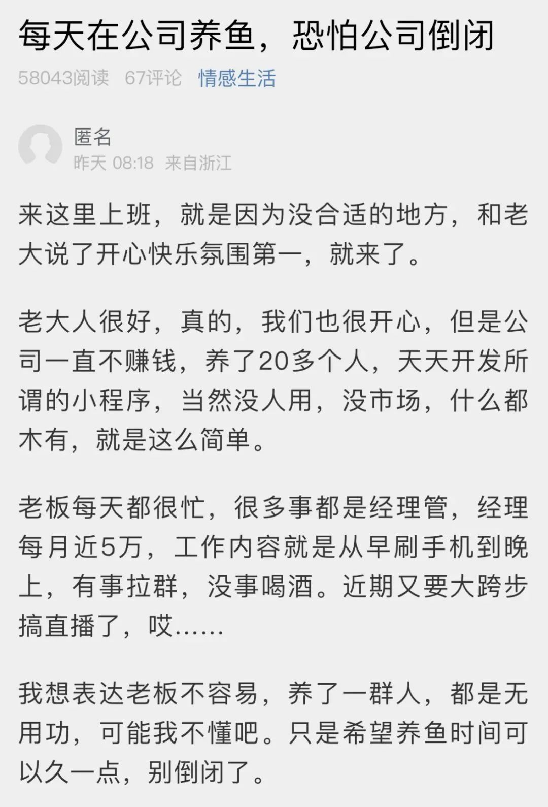 昨天,又一位网友发帖,说自己也是每天在公司「养鱼」——