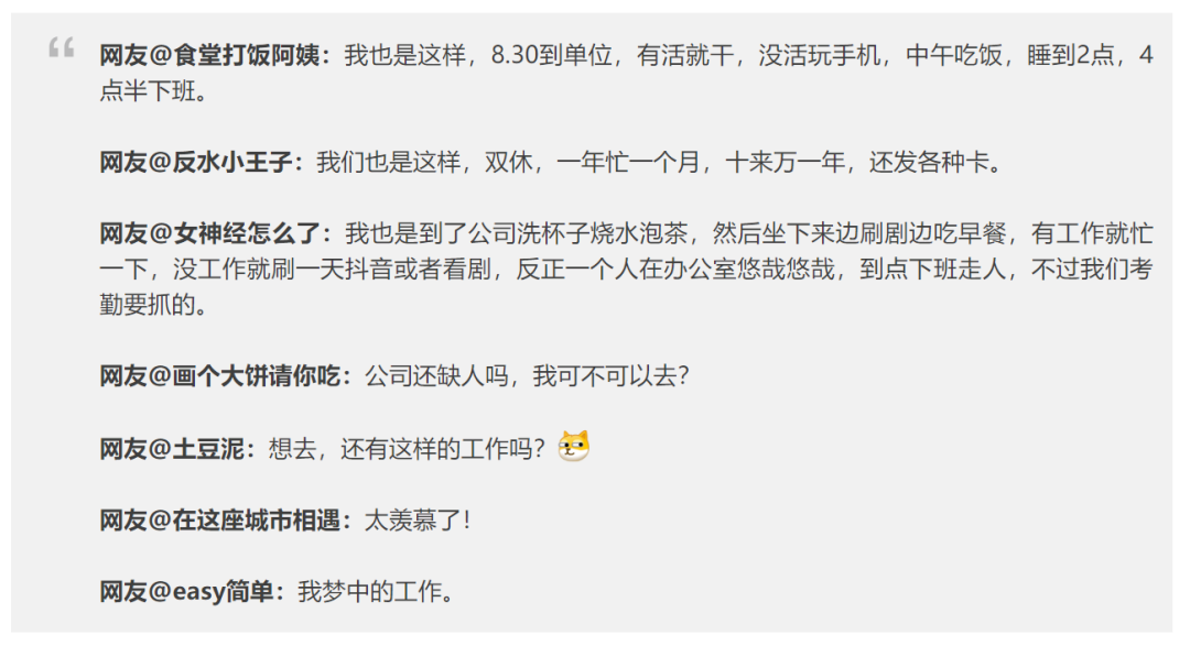 这样的工作让很多网友羡慕。有人表示,想去,还有这样的工作吗?但也有网友表示,还是要有忧患意识。有大量时间可以“摸鱼”说明可替代性强,或许还意味着公司发展不佳,如果习惯了这种状态,就是把自己荒废掉了。