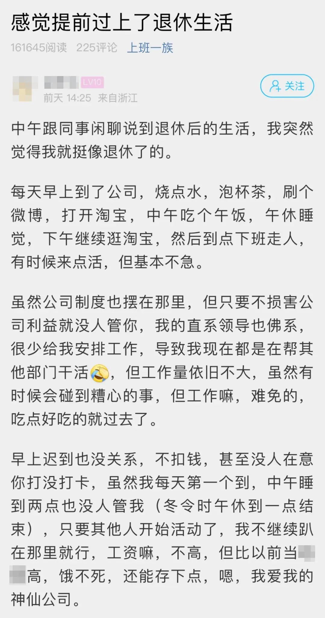 近日,浙江萧山一95后网友发帖称:中午跟同事闲聊,说到退休后的生活,我突然觉得我就挺像退休了的。每天早上到了公司,烧点水,泡杯茶,刷个微博,打开淘宝,中午吃个午饭,午休睡觉,下午继续逛淘宝,然后到点下班走人。有时候来点活,但基本不急。早上迟到也没关系,不扣钱,甚至没人在意你打没打卡,工资不高,但饿不死,还能存下点,我爱我的神仙公司。工作轻松,到点下班,还能淘宝刷剧……