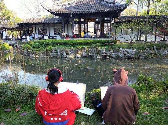 2019年4月6日,清明小长假第二日,江苏省淮安市清晏园内,一群小学生在美术老师的指导下用小手描绘美丽的家乡。