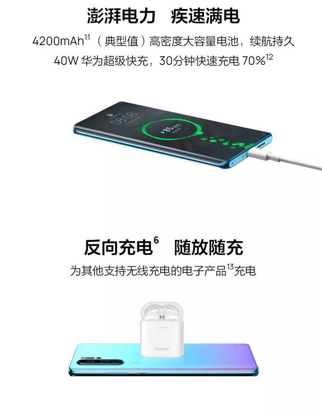 HUAWEI Share升级文件一碰传,创造性地让手机和PC共享剪切板、手机为PC录屏。手机车钥匙功能、与跑步机实时同步数据功能,实现数字化生活的无缝衔接。HUAWEI P30 Pro还拥有优异的能效表现,高达4200mAh电量储备。40W华为超级快充,半小时可充电70%。P30 Pro支持15W华为无线快充,以及突破性的无线反向充电,轻轻一贴便来电。P30 Pro全新升级由液冷热管、石墨烯、石墨组成的新一代HUAWEI SuperCool超强散热系统,让性能得以全情释放。