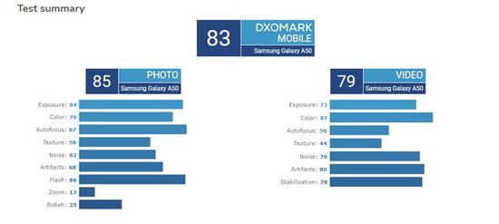 三星A50的拍照得分为85分,视频拍摄得分为79分,总分83分。