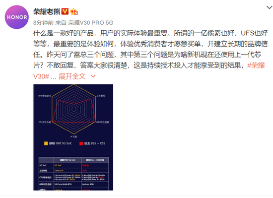 看到自家5G芯片被如此贬低,荣耀业务部副总裁(产品)熊军民开始反击,他也做了一张对比图,但得出的结论完全相反,熊军民称,荣耀V30
