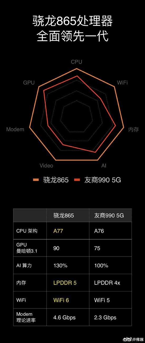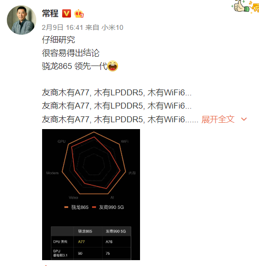 近日,小米集团副总裁常程在微博上发文,用骁龙865对比友商990 5G,称友商木有A77, 木有LPDDR5, 木有WiFi6,很容易得出结论,骁龙865 领先一代。