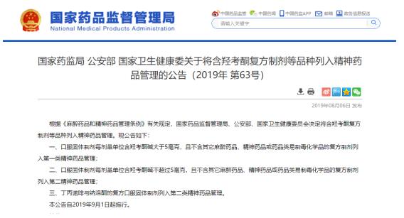 根据《麻醉药品和精神药品管理条例》有关规定,国家药品监督管理局、公安部、国家卫生健康委员会决定,将含羟考酮复方制剂等品种列入精神药品管理。现公告如下:
