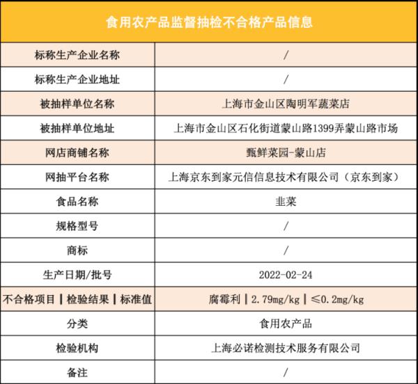 上海市市场监督管理局2022年第18期省级食品安全抽检信息根据《中华人民共和国食品安全法》《上海市食品安全条例》等规定,现将我局开展本市食品安全抽检相关信息公布如下:本次抽检信息涉及3大类食品,包括:水果制品、淀粉及淀粉制品、食用农产品等。抽检样品共计158批次,其中合格157批次、不合格1批次。不合格样品甄鲜菜园——蒙山店(经营者为上海市金山区陶明军蔬菜店)在京东到家(网店)销售的韭菜 (不合格项目:腐霉利 )。