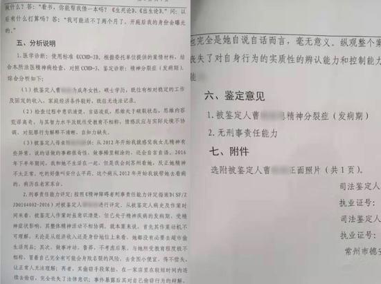通过对曹丽娜的询问笔录、苏州广济医院出院病历,以及南京脑科医院出院记录进行文证审查,6月5日,德安医院鉴定所最终给出的鉴定意见是,“被鉴定人曹丽娜患精神分裂症(发病期),无刑事责任能力。”