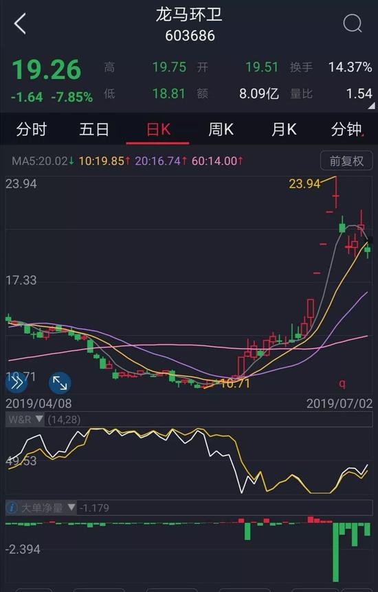 作为垃圾分类概念股,龙马环卫近期股价表现抢眼。东方财富Choice数据显示,龙马环卫股价连续在6月19日、6月20日、6月21日、6月24日四个交易日涨停;此后一个交易日,6月25日,龙马环卫股价涨幅达4.55%;6月26日,龙马环卫股价跌停。7月1日,龙马环卫股价收报20.90元,涨幅达5.13%。近期,龙马环卫多次发布风险提示公告。公告显示,截至2019年第一季度,公司垃圾分类涉及的环卫装备收入和环卫服务收入占比较小。