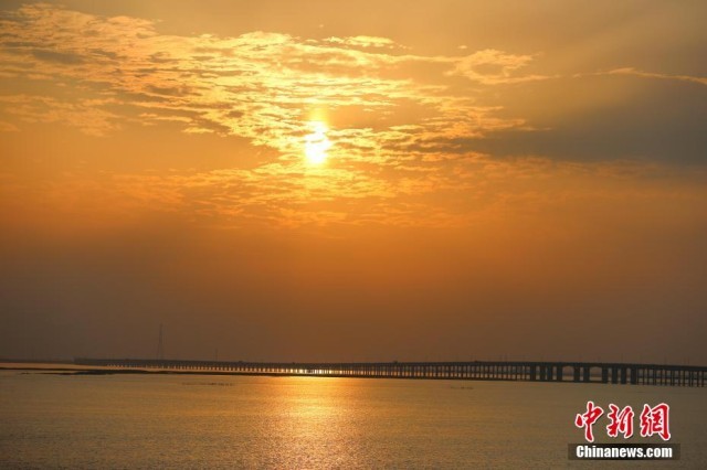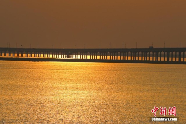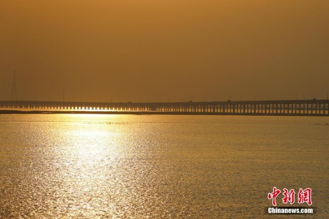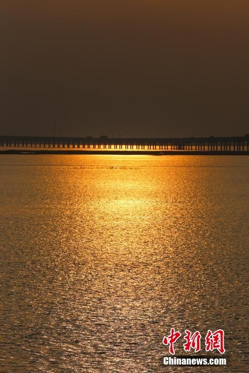 金色夕阳穿过杭长高速金溪湖特大桥洒向宽广的湖面,壮美如画。