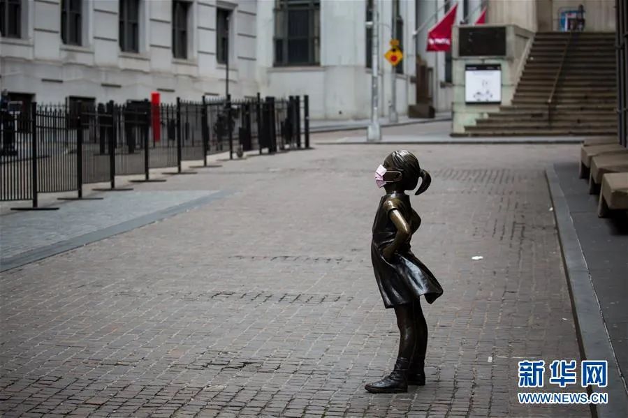 ▲这是在美国纽约证券交易所前拍摄的被人戴上口罩的“无畏女孩”铜像(4月27日摄)。