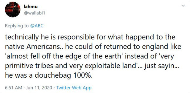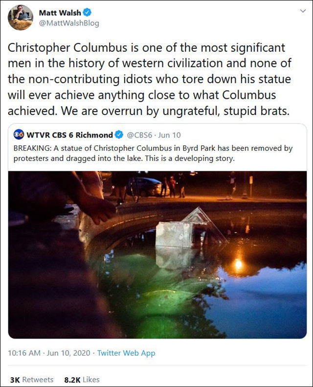 美国右翼新闻社论网站“每日电讯”(Daily Wire)评论员马特·沃尔什(Matt Walsh)则称,哥伦布是“西方文明”历史上“最重要”的人物:“那些拆毁哥伦布雕像的无用白痴当中,没有谁能取得哥伦布的成绩。到处都是不懂感恩的愚蠢小孩。”