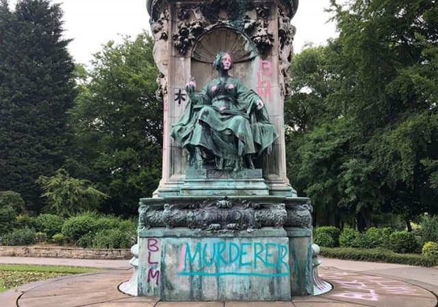 《约克郡早报》9日报道,英国利兹市伍德豪斯穆尔广场上的维多利亚女王雕像,也被人喷上涂鸦:“种族主义者、杀人犯、奴隶主”。