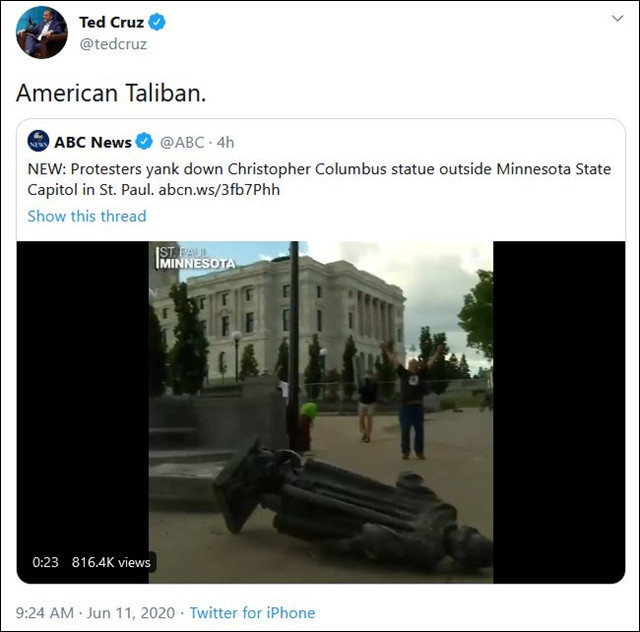 得州共和党反华参议员泰德•科鲁兹(Ted Cruz)在推特上,将推倒雕像的人称为“美国的塔利班”。